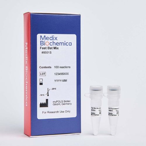 Fast Bst Mix is a ready-to-use mix containing recombinant DNA polymerase expressed by Geobacillus stearothermophilus. The Bst DNA polymerase displays high strand displacement activity, exhibits 5’ to 3’ polymerase activity, but lacks 5’ to 3’ exonuclease activity. Fast Bst Mix is tolerant to inhibitors, enabling rapid and robust isothermal nucleic acid amplification reactions at a constant temperature. The typical reaction temperature is 65°C. Addition of an intercalating dye allows the reaction to be monitored using a real-time PCR instrument.