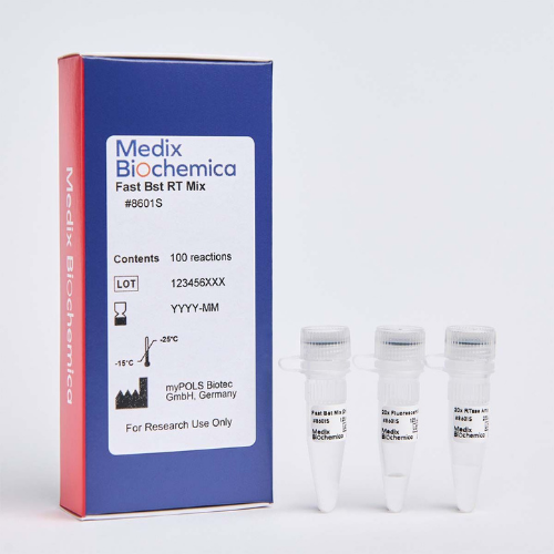 Fast Bst RT Mix is a ready-to-use mix containing recombinant DNA polymerase expressed by Geobacillus stearothermophilus. The Bst DNA polymerase displays high strand displacement activity, exhibits 5’ to 3’ polymerase activity, but lacks 5’ to 3’ exonuclease activity. Fast Bst RT Mix also contains an efficient thermostable reverse transcriptase with an RNase inhibitor (RTase Amp) to prevent degradation of RNA templates by RNases. Fast Bst RT Mix is tolerant to inhibitors, enabling rapid and robust isothermal nucleic acid amplification reactions at a constant temperature. The typical reaction temperature is 65°C. Addition of an intercalating dye allows the reaction to be monitored using a real-time PCR instrument