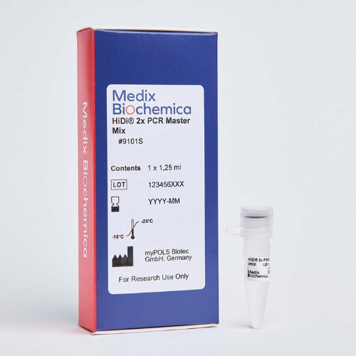 HiDi® stands for High Discrimination of mismatches at the 3’-terminus of primers in PCR. HiDi® 2x PCR Master Mix is a ready-to-use master mix specially optimized for assays in which high discrimination with SYBR chemistry is required. The combination of highly selective aptamer-based fast-start formulated HiDi® DNA polymerase and an optimized buffer with ultrapure dNTPs ensures simple reaction setup and relible results. HiDi® DNA polymerase efficiently amplifies from primers that are matched at the 3'-end and discriminates primers that are mismatched. By using HiDi® DNA polymerase, less than 10 copies of a mutation can be detected in a background of > 10^4 wild-type copies.