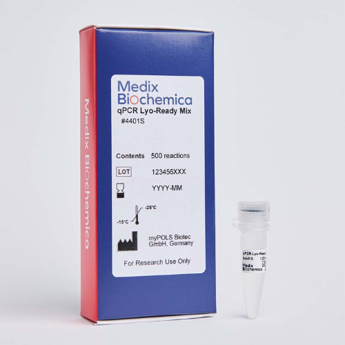 qPCR Lyo-Ready Mix is a universal probe mix that allows robust, sensitive, and fast qPCR for the detection of single or multiplex DNA targets. qPCR Lyo-Ready Mix contains optimized excipients, buffer, PCR enchancers and an antibody-regulated hot-start Taq DNA polymerase and is ready to be lyophilized to produce stable reagents at room temperature. Upon addition of target specific primers/probes to the mastermix, the mixture can be lyophilized directly, without the need to add additional excipients. qPCR Lyo-Ready Mix is compatible with several probes such as TaqMan® and Scorpions®.