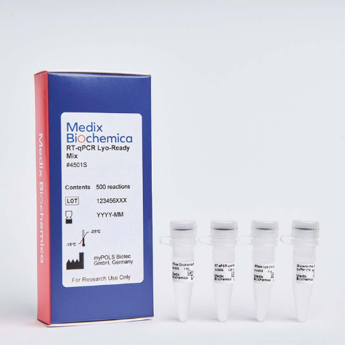 RT-qPCR Lyo-Ready Mix is a universal probe mix that allows robust, sensitive, and fast RT-qPCR for the detection of single or multiplex RNA or DNA targets. RT-qPCR Lyo-Ready Mix contains optimized excipients, buffer, PCR enchancers and an antibody-regulated hot-start Taq DNA polymerase and is ready to be lyophilized to produce stable reagents at room temperature. RT-PCR Lyo-Ready Mix is ready to be lyophilized to produce stable reagents at room temperature. Upon addition of target specific primers/probes and reverse transcriptase (RTase Lyo) to the mastermix, the mixture can be lyophilized directly, without the need to add additional excipients. RT-qPCR Lyo-Ready Mix is compatible with several probes such as TaqMan® and Scorpions®.